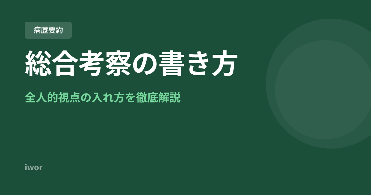 総合考察は「医学的考察」「全人的考察」「自己省察」の3要素で構成するのが王道です。中でも全人的視点がAccept・Rejectを分ける最大の鍵であり、社会的背景・心理的側面・退院後の生活・患者の意向の4軸から、症例に応じて2〜3軸を選んで具体的に記載しましょう。教科書の丸写しや抽象的な感想は避け、あくまで「この患者さん」の考察にすることが大切です。全人的視点の書き方をさらに深掘りしたい方は、「全人的視点」の書き方|具体例とテンプレートで解説も参照してください。総合考察が不十分で差し戻しされるケースの具体的な対策は病歴要約の差し戻し対策で詳しく解説しています。AIを活用して考察の下書きを効率的に作成する方法は病歴要約の総合考察をAIで下書きする方法でプロンプト例つきで紹介しています。
