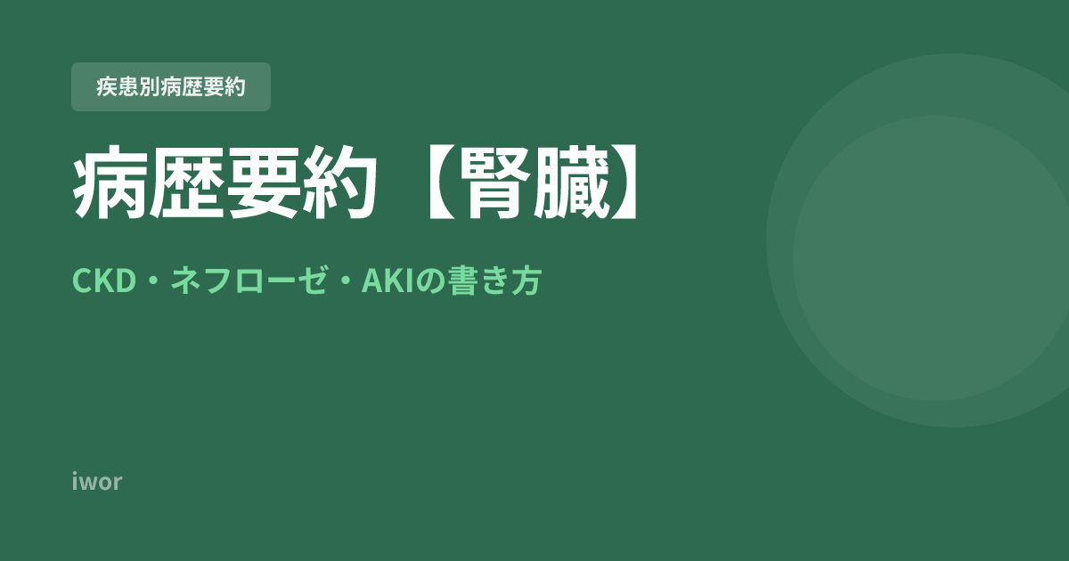 腎臓疾患は、高血圧・貧血・電解質異常・骨ミネラル代謝異常など複数のプロブレムが絡みます。病歴要約 作成の手引きにあるとおり、プロブレムリストには「診断名だけでなく問題となる項目を挙げる」ことが求められます。「#1 CKD G4A3」だけでなく、「#2 腎性貧血」「#3 二次性副甲状腺機能亢進症」「#4 高K血症」など、関連するプロブレムを列挙しましょう。