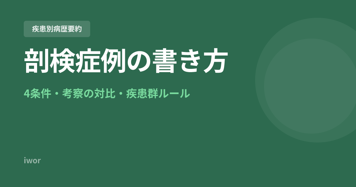 剖検症例は29病歴要約の No.29 に配置される特別な1篇です。他の28篇とは異なる独自の条件があり、考察でも ** 臨床経過と剖検所見の対比** が求められます。この記事では、病歴要約 作成の手引き(2023年10月版)に基づいて、剖検症例の書き方を解説します。